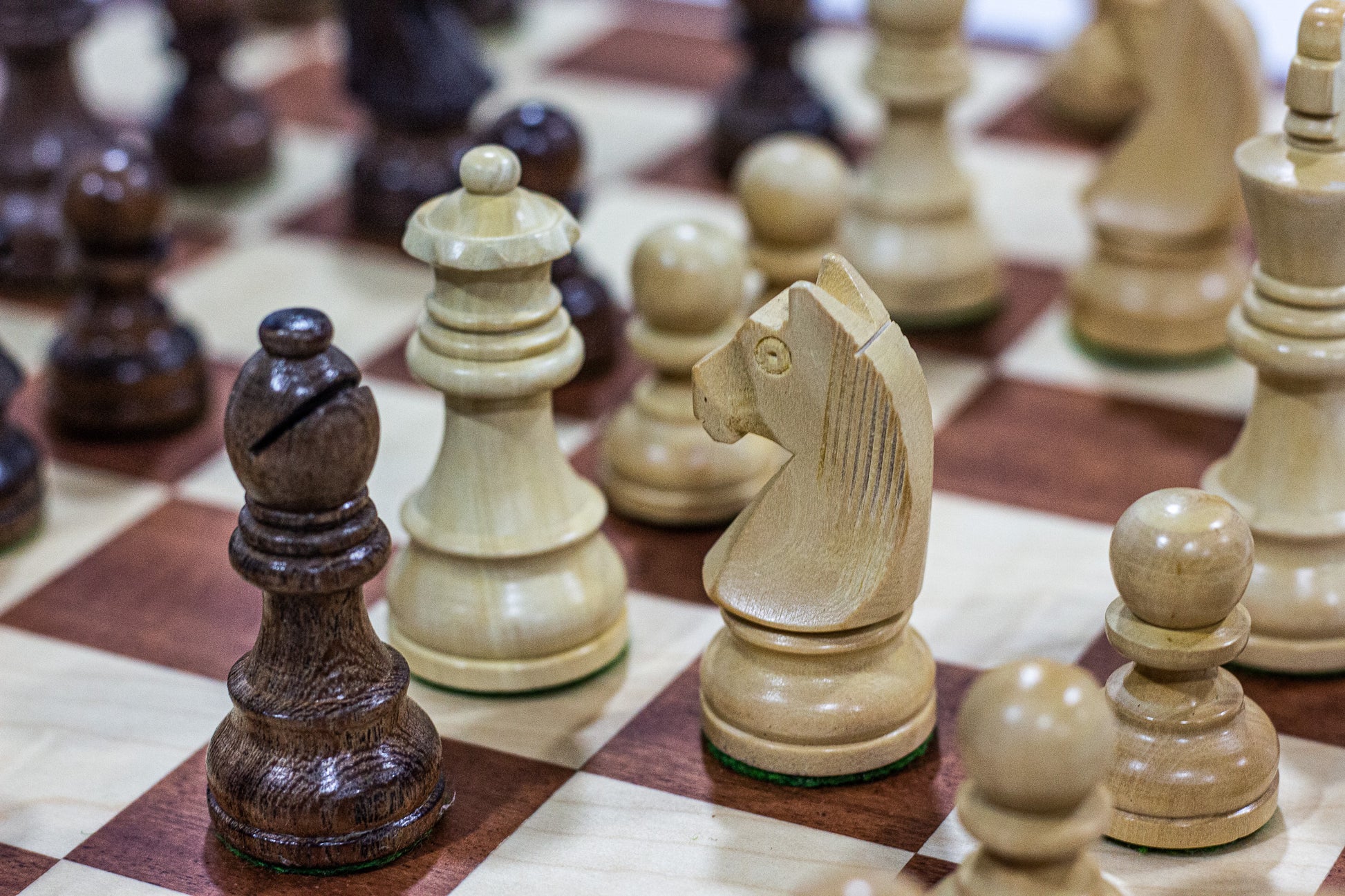 Perfect wooden set for a 40 cm square board , i use it for training myself or game challenges .The knights are beautifully carved but still simplistic and modern look .Perfect for travelling or just displaying it on your desk at work