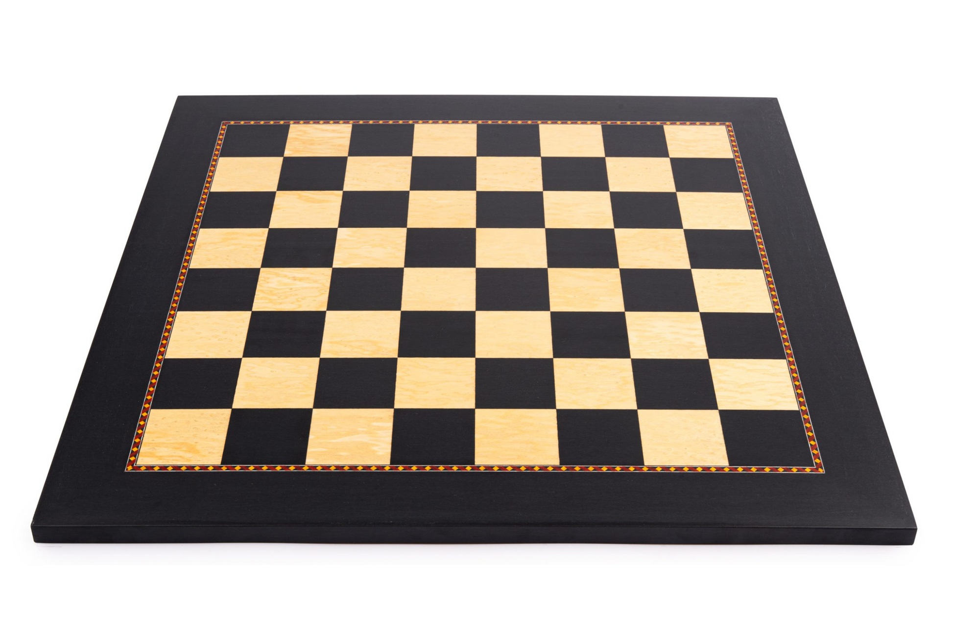 Handmade chess board. This model combines the colors of the elegant stained black of the tulip wood with the pecked cream color of the root wood. Its surface has a matte varnish that enhances the richness of the wood tones and provides a smooth texture for the chess pieces to slide with precision.